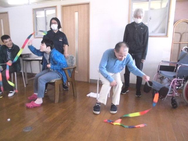 あさひ会ブログ 一覧へ戻る 音楽活動♬2025-10-29朝日山学園では、月に1回音楽活動に取組んでいます。スタッフの動きを模倣して楽器を演奏したり🎹、リボンを振りながらリズムにのったり🎶、思い思いに楽しまれています。リボンを使ったリラクゼーションは、好まれる方も多く、色んな振り方をしてリボンの動きを楽しまれています